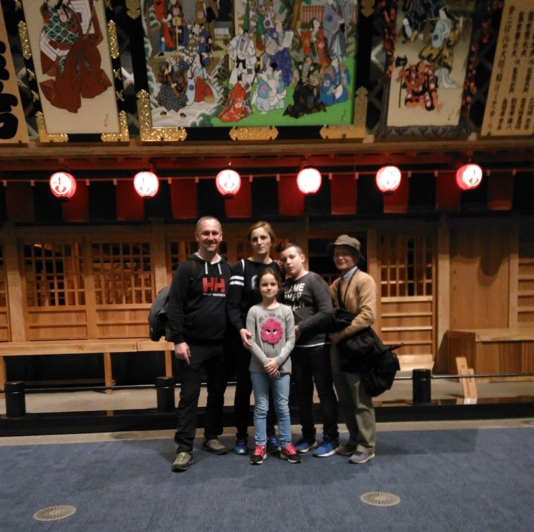 A Polish family and Mr.Iwatate (the chairperson of KASHIWA GOODWILL GUIDE ASSOCIATION) posed against a theater set of Edo Historical Museum. Their smiles made me happy.